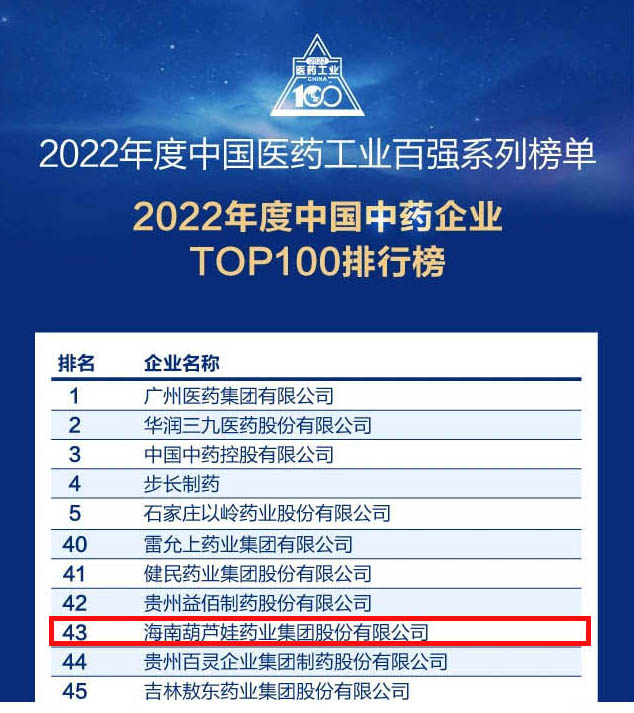 会议期间,一年一度的中国医药工业百强系列榜单隆重揭晓,z6com尊龙药业集团凭借领先的研发优势和扎实的生产实力以及稳健的市场推广能力,连续第四年成功入选“2022年度中国中药企业TOP100排行榜” ,排名稳步上升至第43位。
